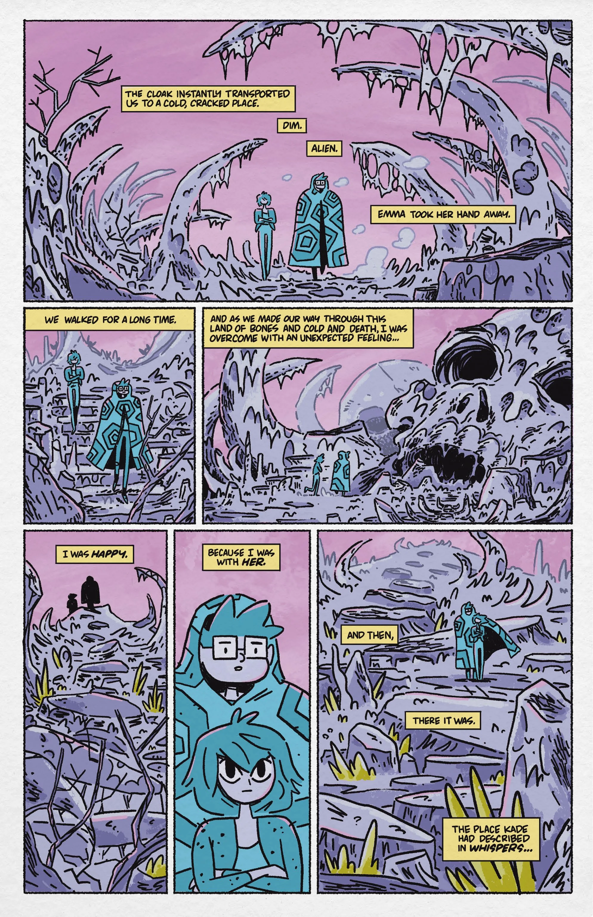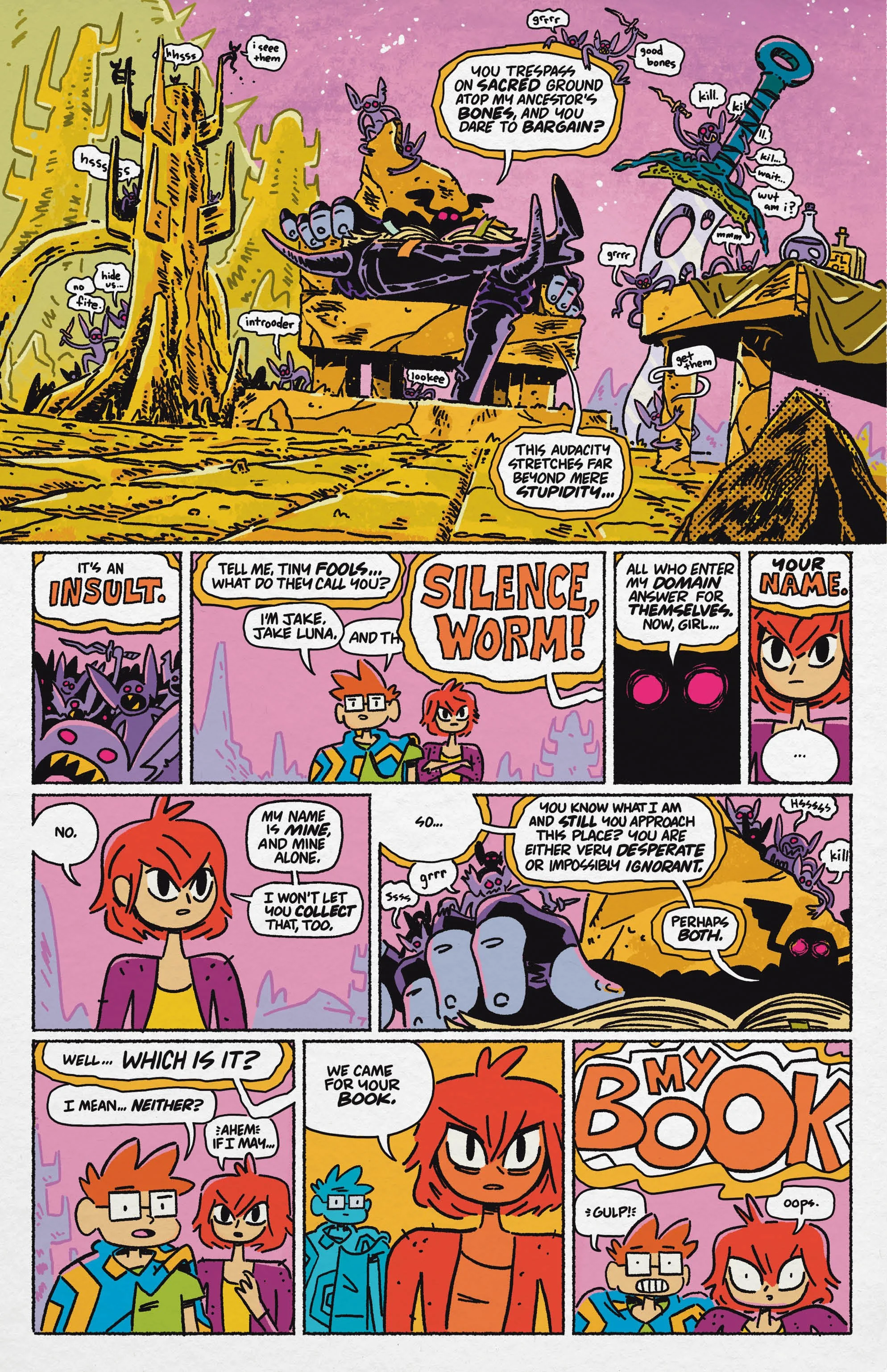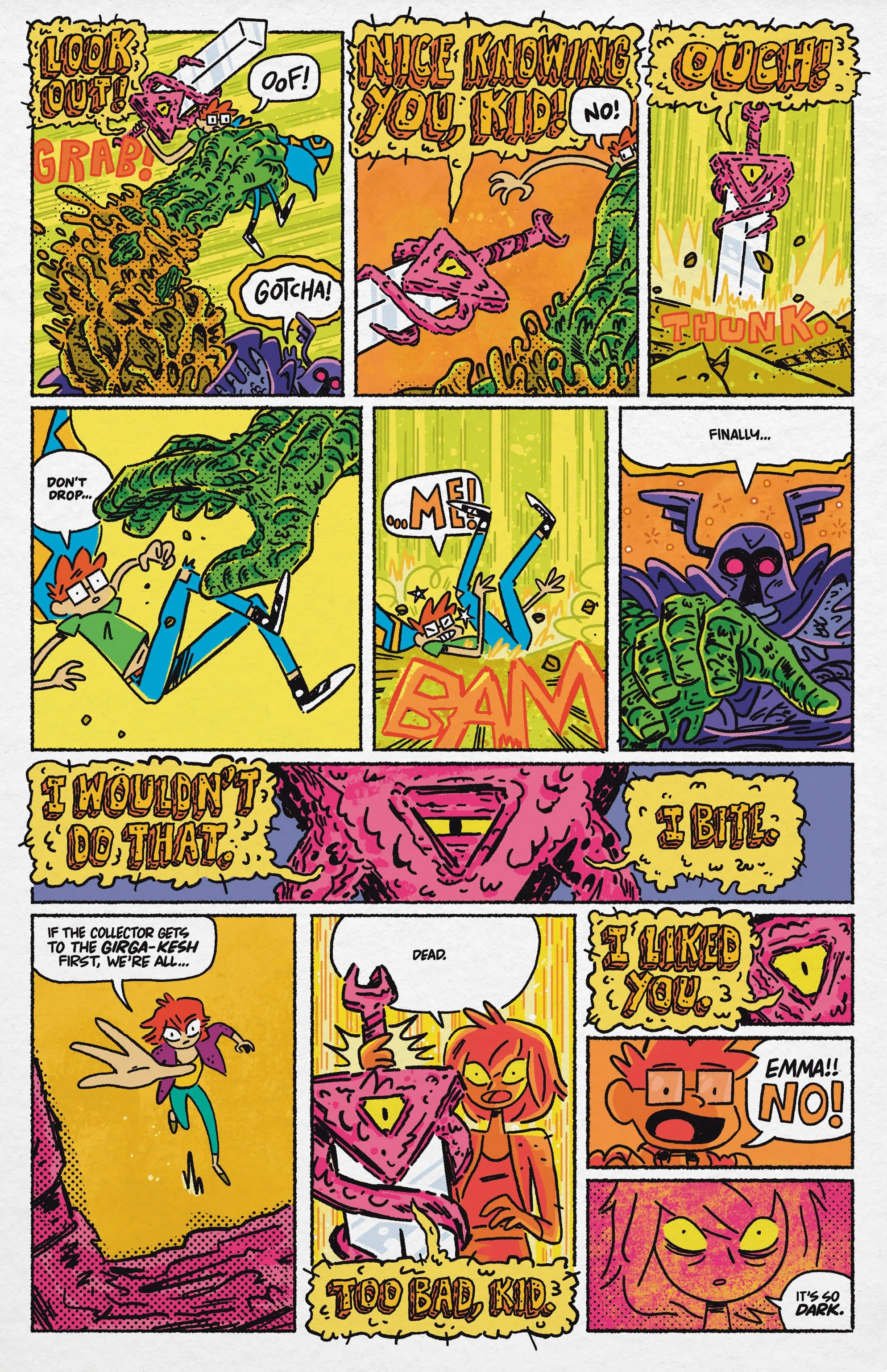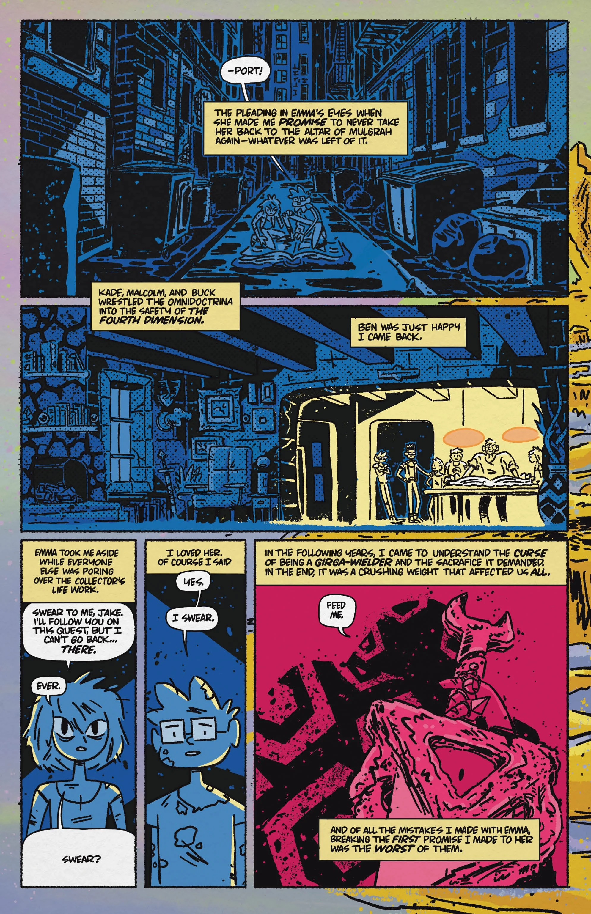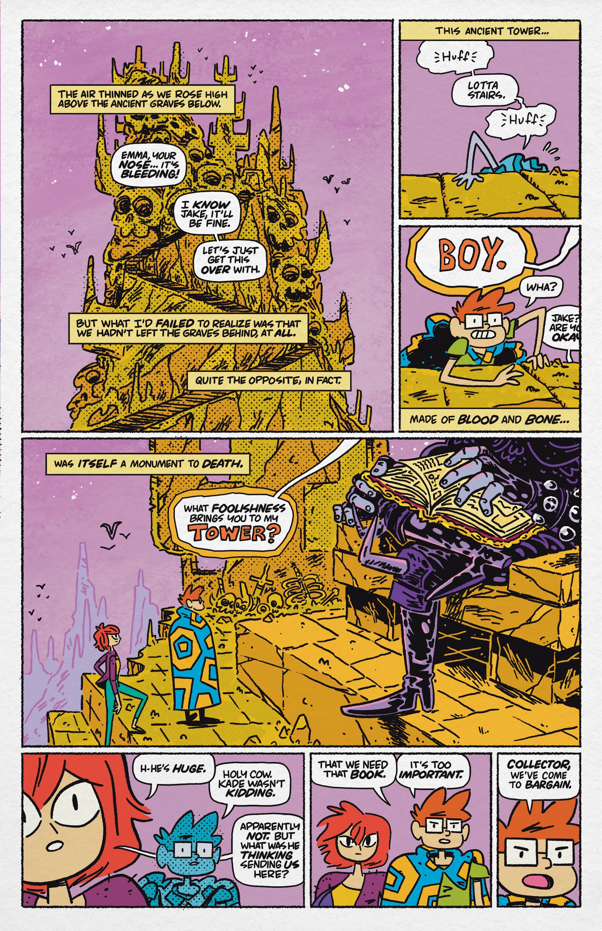 Jake and Emma teleport to the Altar using a magical Traveling Cloak. There, they argue with and battle The Collector who, in the end, destroys the tower before he’s able to steal the Girga-Kesh for his own. Jake and Emma narrowly escape with the book and find that the Omnidoctrina holds more than just historical knowledge—it contains a name written in ancient ink: Jake Luna. It also carries a cryptic warning about the Girga-Kesh: “One must not wield it. One must not listen. One must not trust.”