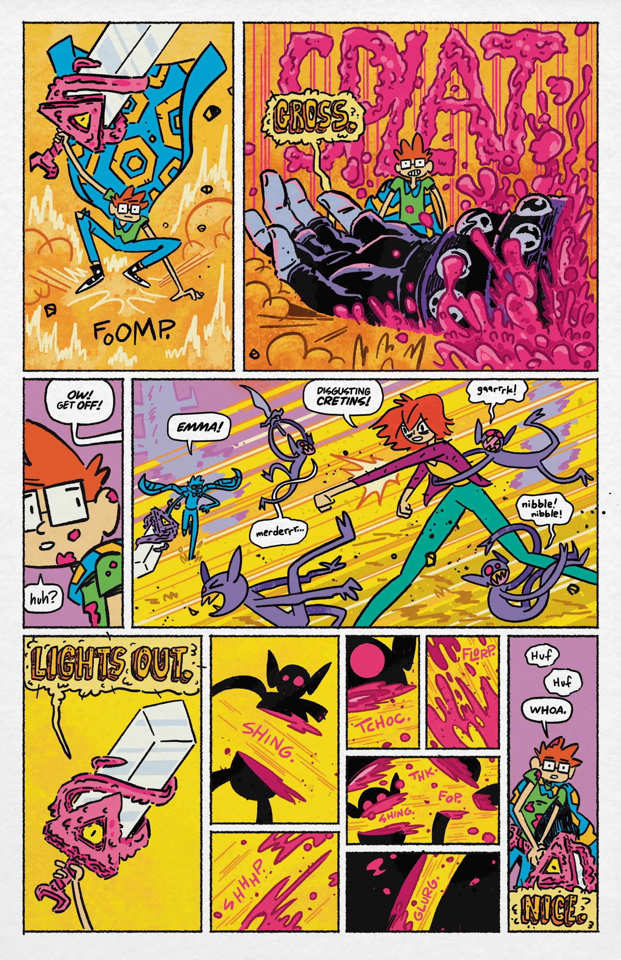 Book One’s major threat emerges in the form of The Daughters of Hollowstar, a trio of ancient vampire witches who have been hiding in plain sight in the penthouse suite of a swanky downtown high rise, feeding on pizza delivery boys. Their plan is set in motion when they kidnap Bucky and Ben—the latest employees for Peppi’s Pizza—and begin preparing for a disgusting transformation where they’ll merge into a gigantic, horrific blob-monster with an insatiable appetite for blood and extra cheese.